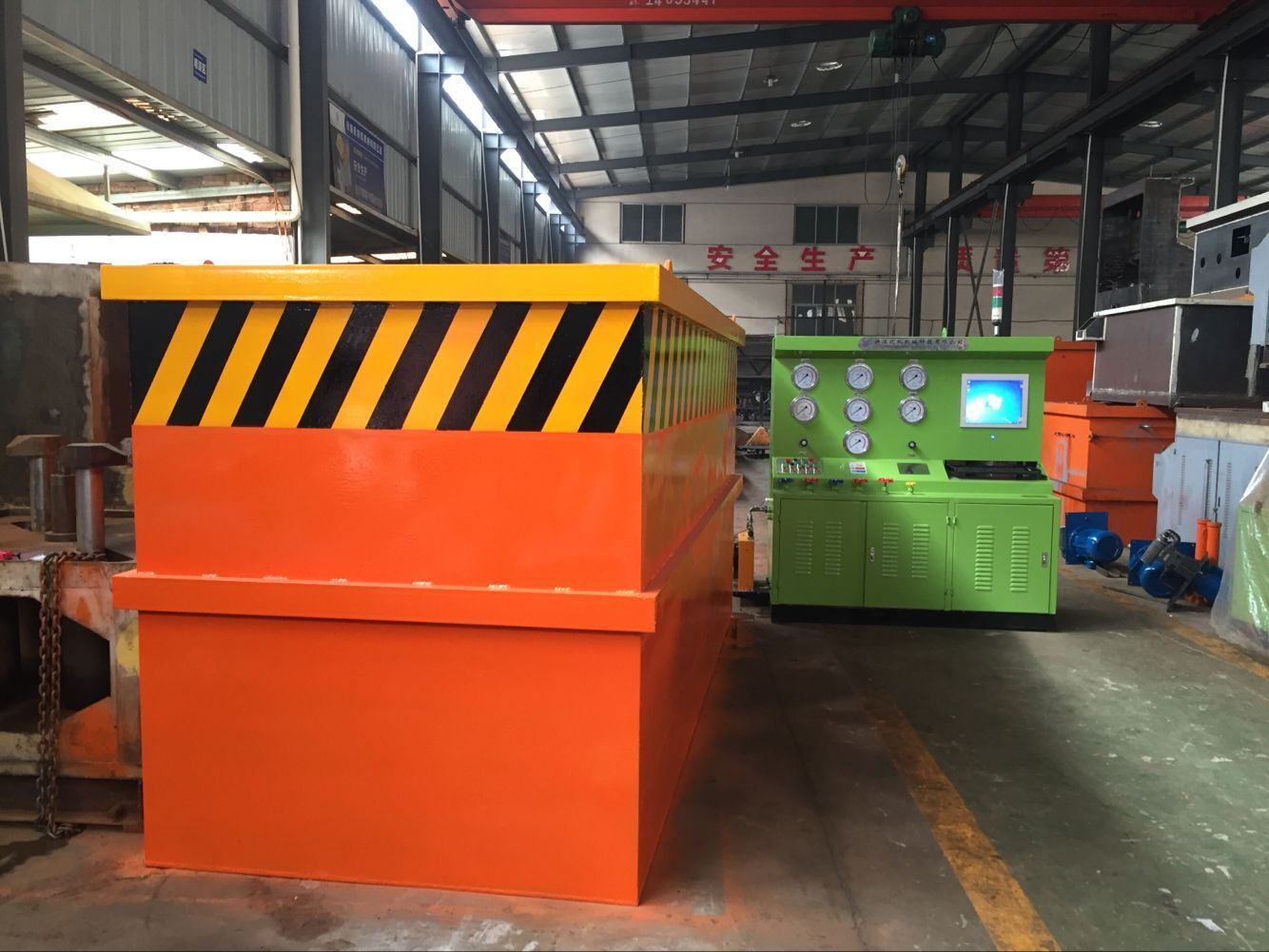 三、接通電源,按油泵啟動按鈕,檢查電機轉動方向,是否正確(順時針方向)進行5—1 O分鐘空載運轉后,調節(jié)油泵壓力在5 0MPa進行試機,各種動作,檢查各管路有無泄漏,發(fā)現不良現象,應立即停機排除。